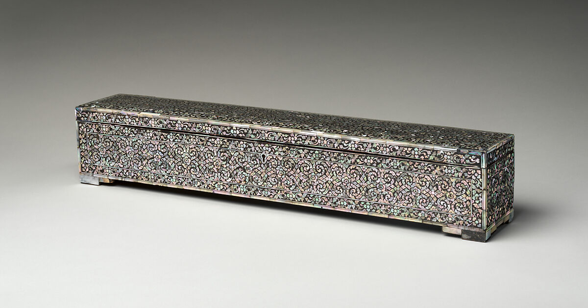 - Medium: Lacquered wood with mother-of-pearl inlay; brass hinges and keyed lock.
