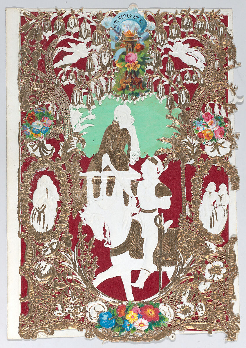 - Medium: Cameo-embossed, open-work, gilded, glossy lace paper, chromolithography, die-cut scraps
