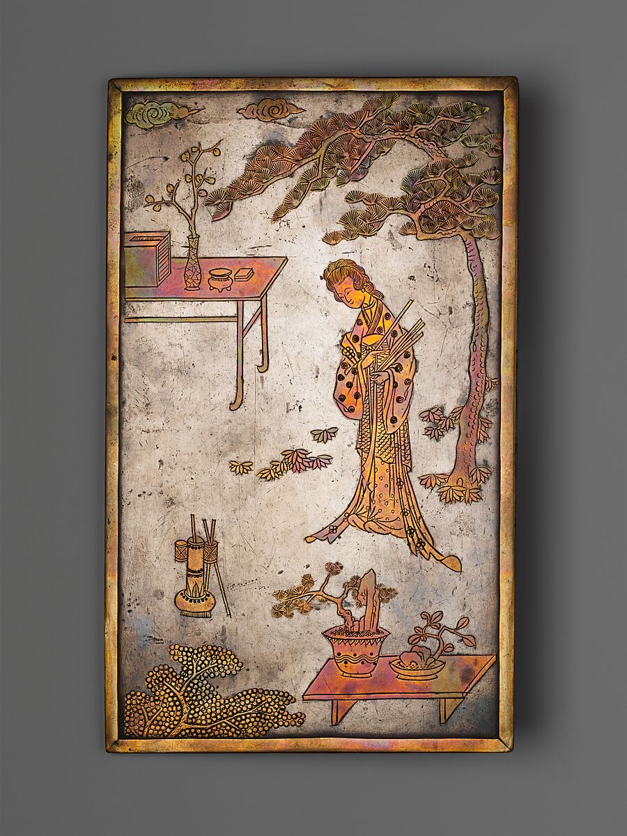 The touhu game was traditionally designed as a way for players to focus their thoughts and achieve a peaceful mental state, in keeping with the Confucian moral requirement that gentlemen pursue harmony and benevolence. As illustrated in this table screen, the game was not limited to male elites: here, an elegant lady enjoys the game by herself in a garden setting.
