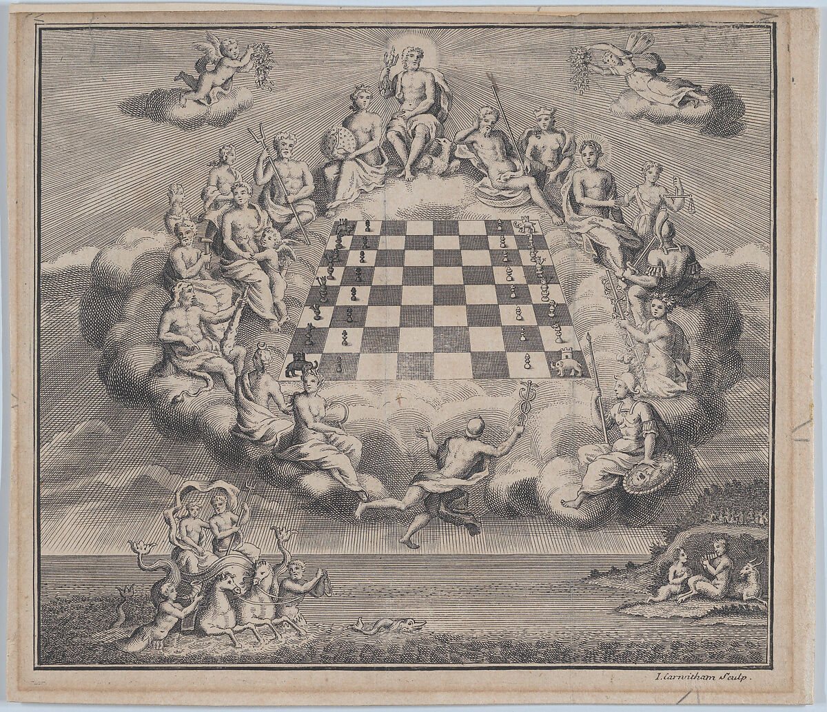Heavenly Scene with the Gods of Olympus Surrounding a Chess Board, Poseidon and Pan Below
