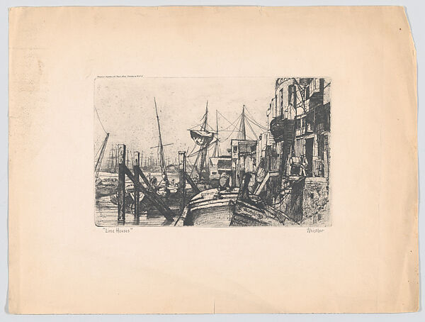 This early twentieth-copy of an etching by James McNeil Whistler demonstrates his long-lived popularity. The artist's created the related print in London 1859 and ot was published in 1871 as part of the “Thames Set” (see MMA: 17.3.333). Slightly fuzzy lines here indicate an image that was transfered and re-etched, and its reproductive character is affirmed by the engraved title and signature below, and publisher’s name above.