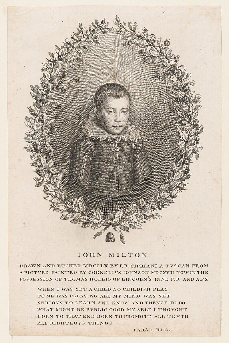 Milton here wears a doublet and lace collar, costume in fashion when he was a boy. Based on a portrait from life, the engraving was published to illustrate a 1761 edition of John Toland's "Life of Milton" then reissued in Francis Blackburne's "Memoirs of Thomas Hollis" (1780).