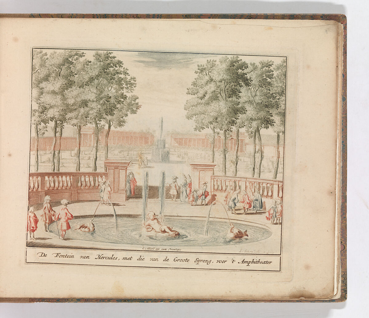 - Title: 'De Fontein van Hercules, met die van de Groote Sprong, voor 't Amphitheater', in: Tooneel Der Voornaamste Nederlands Huizen, En Lust Hoven, Naar T Leven Afgebeeld