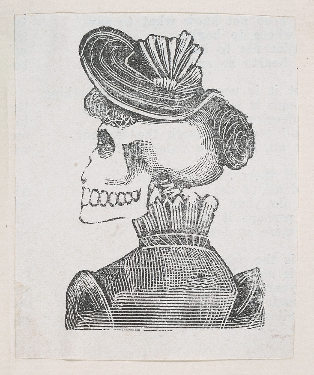 A skeleton with her back turned wearing a coat and hat, from a broaside entitled 'La Calavera de Cupido', published by Antonio Vanegas Arroyo.