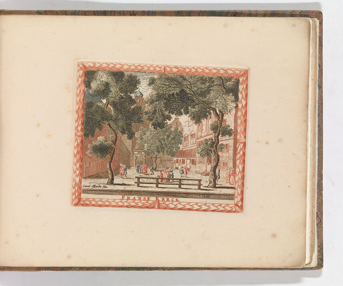 Depiction of the Franse Kerk (French Church) in Amsterdam. Part of a series of country estates and pleasure palaces of the Netherlands published by Carel Allard at the end of the seventeenth or very beginning of the eighteenth century.