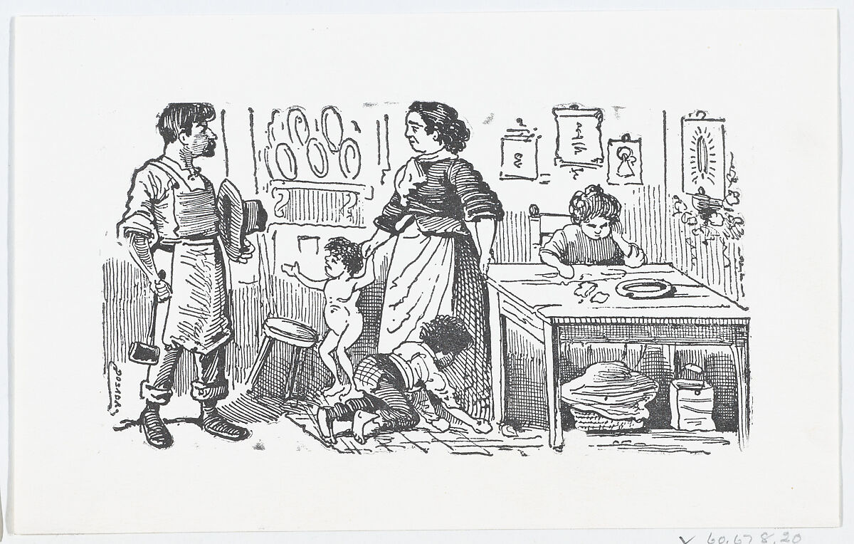 - Title: A domestic scene with a mother holding her child's hand while talking to her husband
