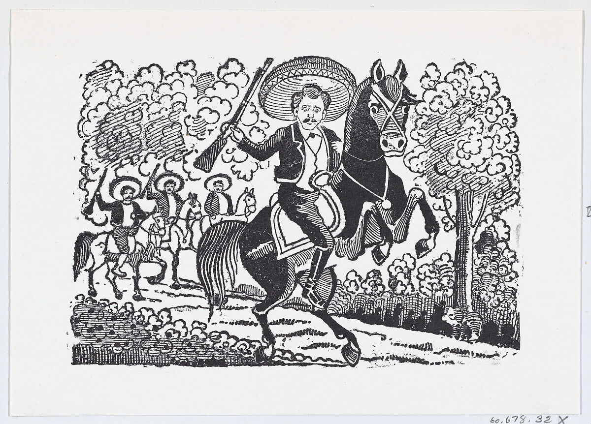 Image included in the broadsheet "El famoso caballo de batalla de Emiliano Zapata" (Imprenta de A. Vanegas Arroyo, ca. 1911).
