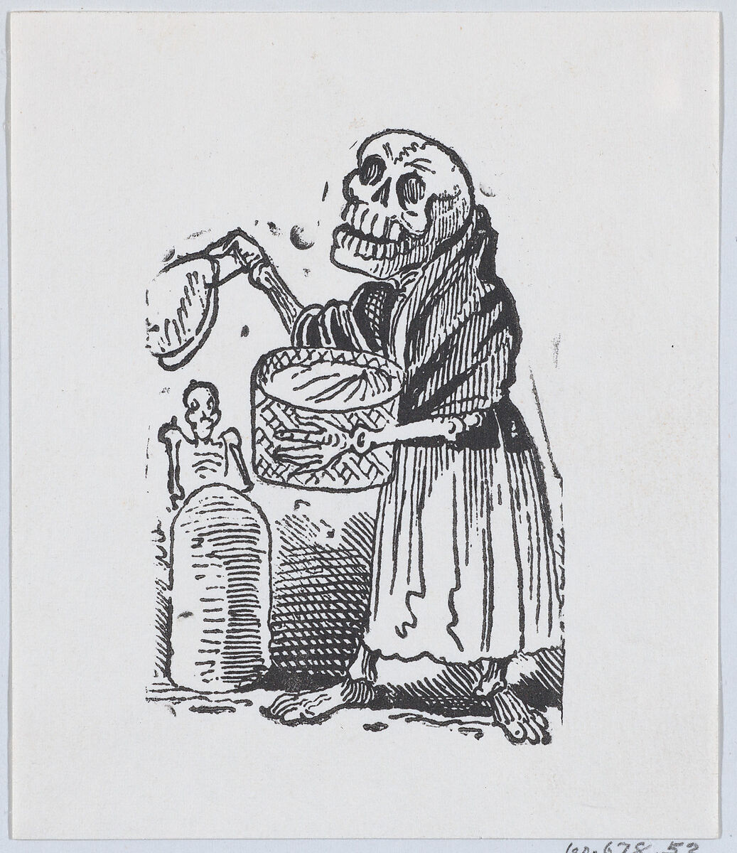 A skeleton selling tortillas from a broadside entitled 'Una Calavera Chusca'