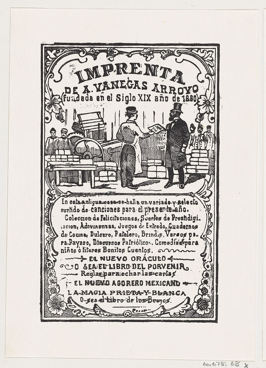 - Title: A print shop with a printer handing something to a gentleman, from the broadside 'Imprenta de A. Vanegas Arroyo'