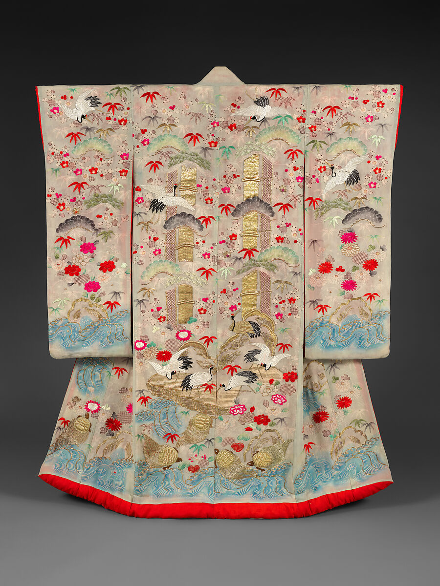 The legendary isle of the immortals, located in the eastern seas according to ancient Chinese legend, is called Mount Penglai. In Japan, where it is called Hōrai, it was frequently represented as a gathering of cranes and tortoises in a bright landscape dominated by pine, plum, and bamboo. An auspicious theme, it was often used, as here, for bridal garments. This lined silk robe, or uchikake, with a wadded hem was meant to be worn as an outer garment, without a sash. It displays a wealth of motifs symbolizing good fortune, steadfastness, and longevity, including the Three Friends of Winter—plum blossoms, pine, and bamboo—cranes and long-tailed tortoises, and chrysanthemums of different colors.