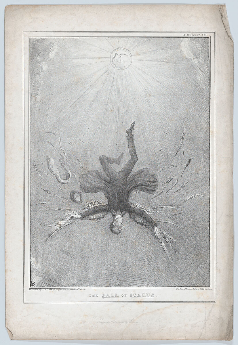 Lord Chancellor Brougham is here cast as Icarus falling through the air after flying too close to the sun (the sun in this image contains the face of William IV). His collapsing wings are lettered "Edinburgh Review," "Society of useful knowledge," "Penny Encyclopædia," "Morning Chronicle," and "Globe," all journals to which the Chancellor contributed articles to praised the king (and by extension himself). The image suggests that recent speeches given during a provicinal tour implied too great a degree of familiarity with the monarch, whose hot response is here to melt the wax of his minister's great seal, causing him to fall from office.