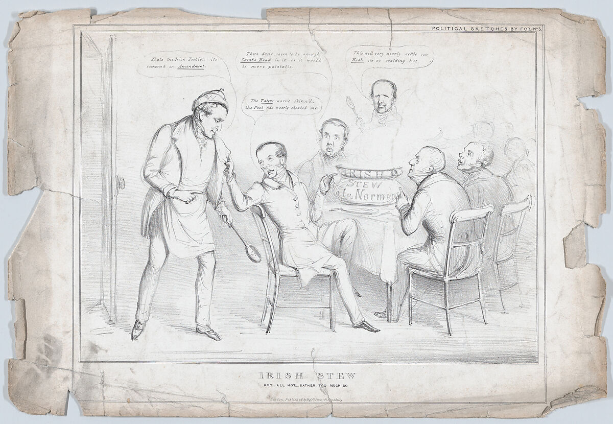 This political satire published by Fores comments on political responses to the Irish Potato Famine. A man standing at left with a spoon (probably William Lamb, Viscount Melbourne, prime minister 1834-41) says "That's the Irish fashion, its reckoned an amendment," while others seated at a table near a huge basin labeled "Irish Stew à la Normande" say "The Taters want skinned and the Peel has nearly choked me," "There don't seem to be enough Lambs Head in it or it would be more palatable," and "This will nearly settle our Hash its so scalding hot." Sir Robert Peel was the leader of the Conservative Party in Parliament and became prime minister in 1841, and the dialogue references the rivalry between Peel and Melbourne (Lamb).