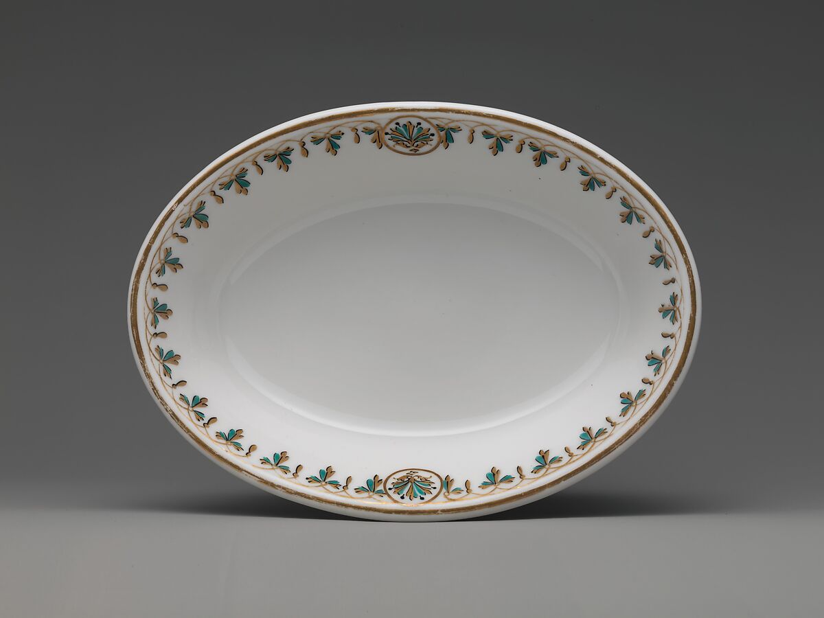 Union Porcelain Works was one of the most important and inventive American porcelain manufacturers in the second-half of the nineteenth century. In addition to their imaginative works designed by the German-born artistic director, Karl H. L. Müller, the firm’s mainstay was the production of heavy porcelain hotel dinnerware. This extensive service was made by Thomas Carll Smith, head of the Union Porcelain Works, as a gift to his daughter, Pastora Forest Smith Chace. The neoclassical decoration of the gilt bellflower and basket motif is complimented by turquoise enamel. Unlike the firm’s more eccentric and lavish designs created for their display at the Philadelphia Centennial Exposition in 1876, the pottery favored a more restrained classical style for their dinner services. This service descended in the Chace family.