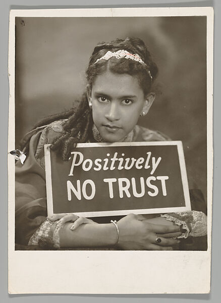 - Title: [Young Woman Cradling "Positively NO TRUST" Sign]