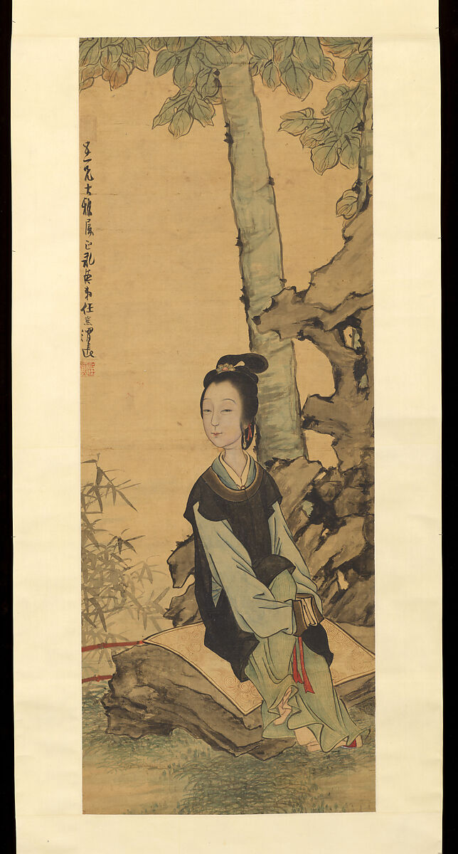 During his tragically short life, Ren Xiong produced some of the most striking and innovative paintings of the nineteenth century. In this image of a dignified woman sitting in a garden, the contrast between the broad strokes used for the setting and the meticulous treatment of the face creates an eerie effect, imparting an unsettling vitality to the figure. Ren’s paintings often reveal an interest in patterning, such as the swirls on the mat that covers the rock. Few paintings by the artist survive, but he was much admired and emulated; this might be by a follower of the next generation.