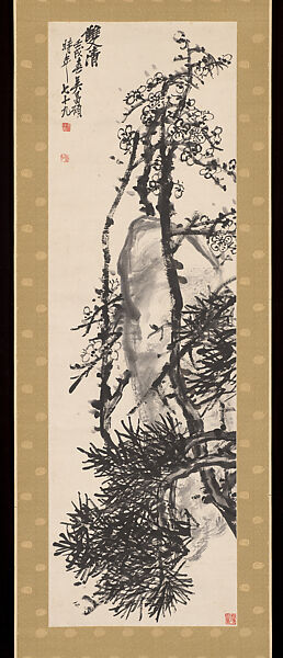 With slashing stokes of jet-black ink, Wu Changshuo depicted the “two purities”—pine and plum blossom—as expressive, nearly abstract marks set against the faint gray wash of a garden rock. The ability to withstand the cold of winter imbued both pine and plum with a sense of virtue and steadfastness that was frequently celebrated in premodern Chinese poetry and visual art.