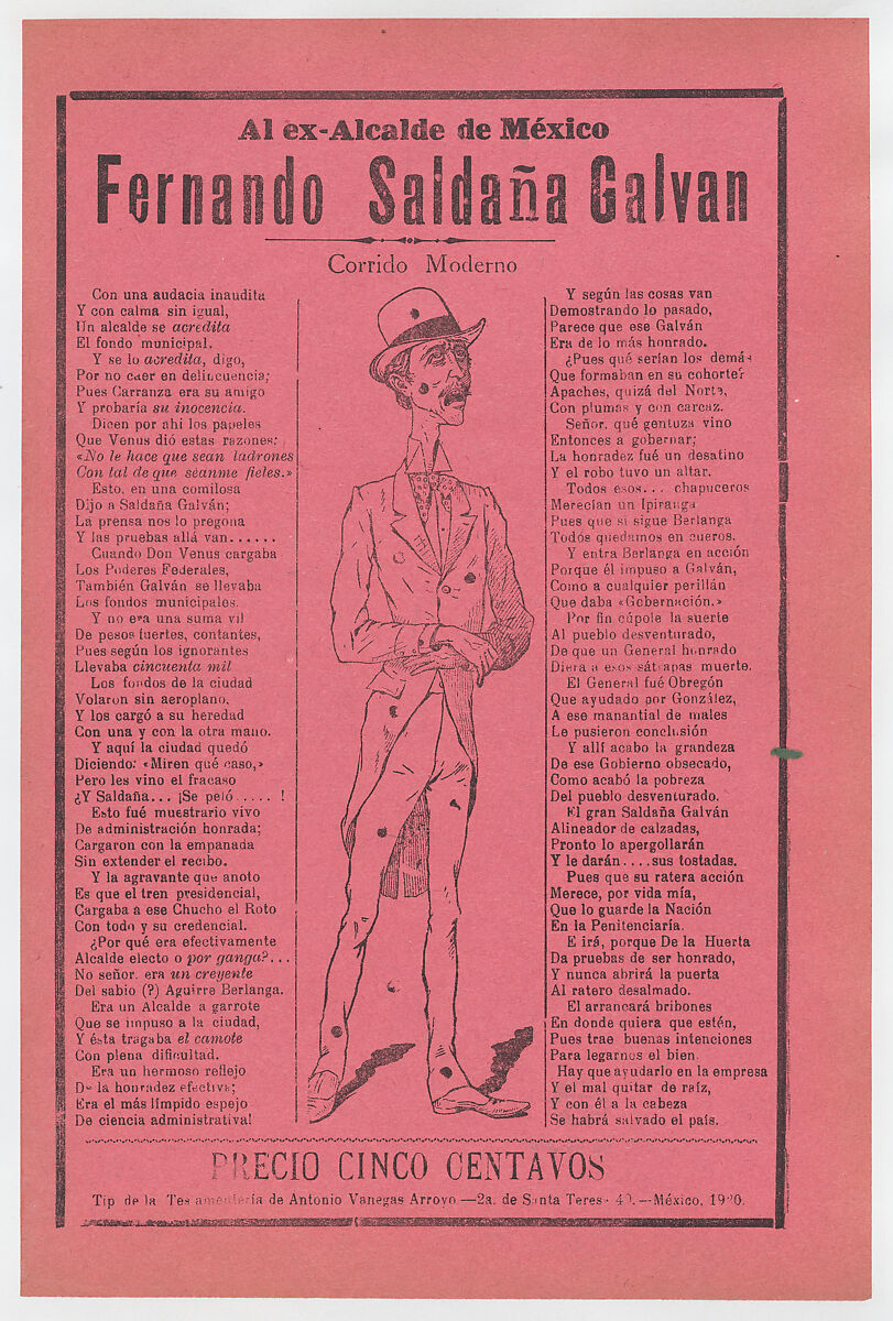 - Title: Broadsheet relating to the ex mayor of Mexico, Fernando Saldaña Galvan, who is standing in the center covered in holes