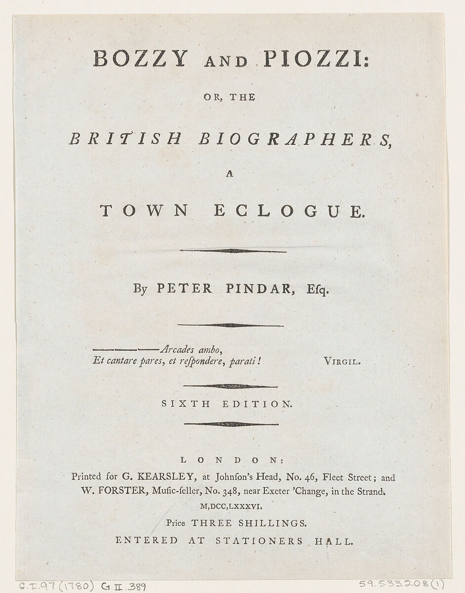 - Title: Title Page, from Bozzy and Piozzi by Peter Pindar, Esq.