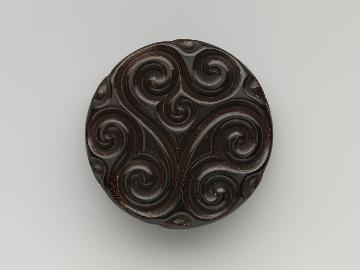 The scrolling design that fills the surface of this box is often called the “fragrant grass” motif in Chinese writings on lacquer. It is closely linked to another pattern featuring abstract scrolls that is popularly known as the “pommel scroll.” Both designs, ubiquitous in carved lacquer, can be traced to abstract patterns in early Chinese lacquers and bronze vessels. The reemergence of this motif during the Song period (960–1279) reflects the fascination with antiquarian imagery that marked this period of Chinese history and the rediscovery of that time of earlier artistic traditions.