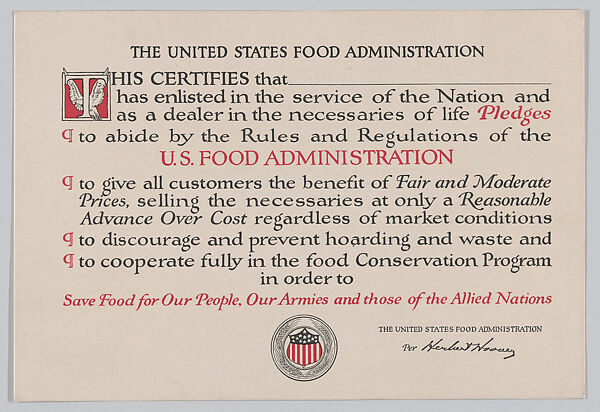 - Title: The United States Food Administration certificate