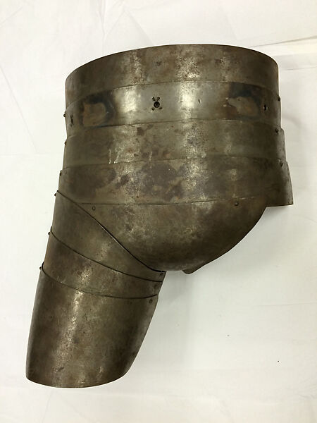 Comprised of eight steel plates, unpolished and rough from the hammer, covering the lower abdomen, crotch, and top of the front of the right thigh. The plates consist of hour horizontal lames, a shaped lame at the base of the crotch, and three plates over the upper thigh. The plates are joined by rivets. Additionally, there are two vertically placed internal canvas straps: one running down the center of the abdomen and the other in the center of the thigh area. There is a canvas strap and buckle at the base of the lower thigh lame for a strap that would encircle the thigh. There are three equally spaced holes in the center lame from the top. Each hole is lined on the inside with a grommet.