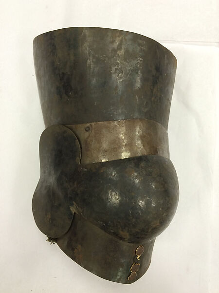 A cloth tag attached to one of the straps reads: "Thigh + knee defense/ T-29/ designed by Mr. Granscay at Met Art Museum 6-24-44." A paper tag reads: "#22 GROIN/ ENGINEERS/ THIGH + KNEE." This knee defense was probably made by Leonard Heinrich in the Armor Shop of the Metropolitan Museum of Art under the direction of Stephen V. Granscay. See the related abdomen, groin and thigh defense, T-31, and greave, T-29.