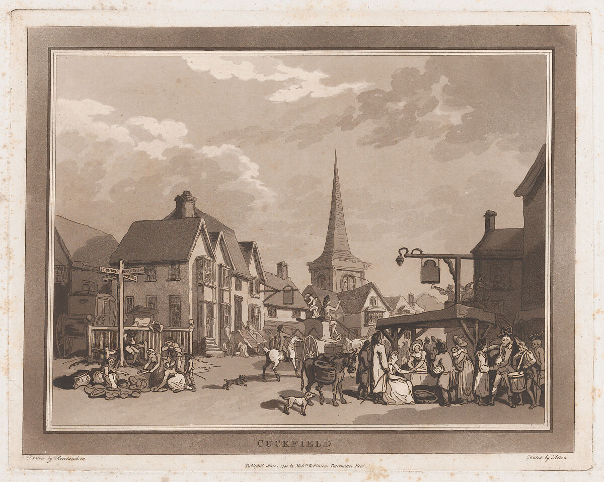 One of a set of eight aquatints devoted to posting houses on the main road from London to Brighthelmstone (Brighton), together with attractions of the seaside resort, this print represents a fair at Cuckfield, with a signpost on the corner of the main street pointing to London, Brighthelmstone, Tun-Bridge and Lewes. Related text tells us that the village is forty miles from London and, "a fair is held, in September, reported to by a great number of pretty rustic females, and by a multitude of happy swains. From Cuckfield to Brighthelmstone, about 14 miles distant, the country is chearful [sic], and the prospects various and extensive."