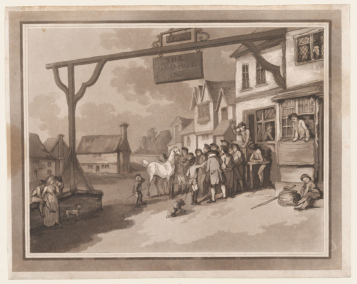 One of a set of eight aquatints devoted to posting houses on the main road from London to Brighthelmstone (Brighton), together with attractions of the seaside resort, this print shows the George Inn with a horse auction in progress. Related text notes that "Crawley,–31 miles from London, is the first town in Sussex, which we visited; but not meeting anything here particularly worthy of notice, continued our route 'till we arrived at Cuckfield,--40 miles distant from London."