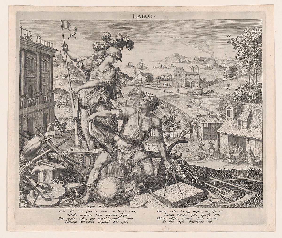 Love, labor, honor, and pain: these are the four stages of human life according to many early modern artists, including Sadeler. In this image of labor, Minerva, goddess of crafts, commerce, and the arts (as well as wisdom), appears above a muscular young man who seems to have been interrupted in the act of measurement. He gazes at a building under construction, with a compass in his left hand, a large architectural treatise in his right, and various instruments of the liberal arts at his feet. In the distance are industrious scenes of men and women engaged in harvesting and weaving. Labor is understood here to encompass not only the virtues of physical activity but also the diligence required to produce works of art, mathematics, and science.