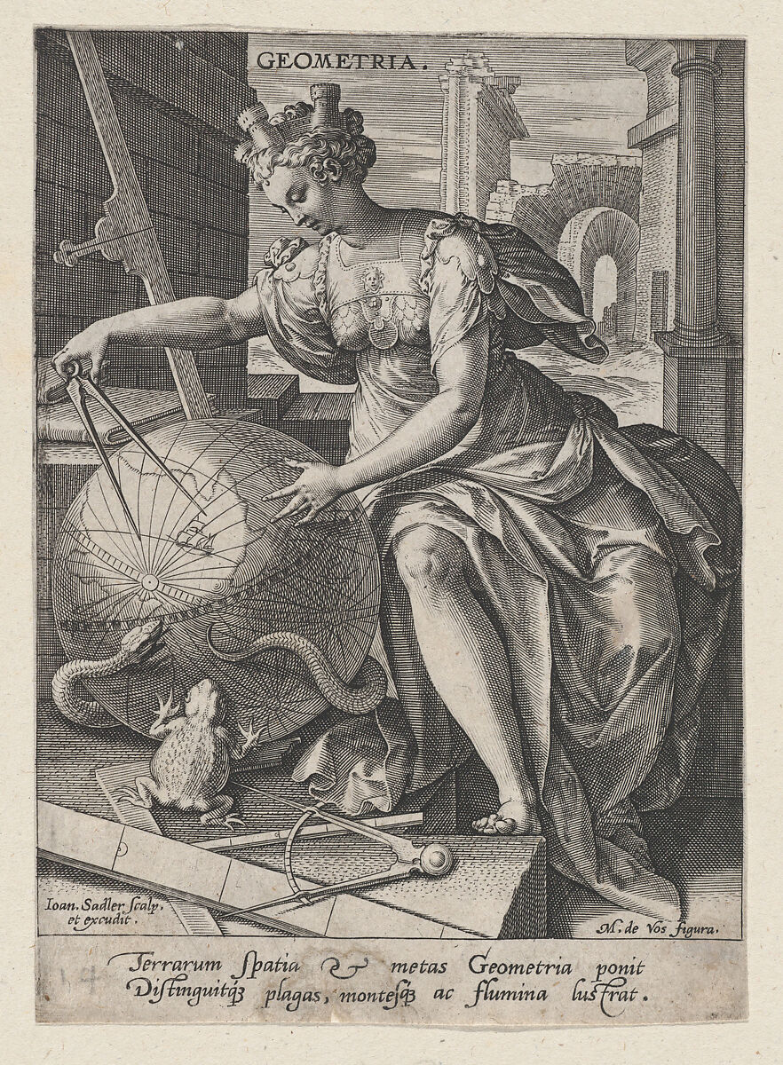 First conceptualized in the Middle Ages, the term "liberal arts" refers to the areas of study deemed necessary to attain an education grounded in classical antiquity. These subjects, which were divided into two categories—the trivium (grammar, dialectic, and rhetoric) and the quadrivium (arithmetic, geometry, astronomy, and music)—became common themes for allegorical prints in the early modern period. While Sadeler conceptualized the practice of arithmetic as a personal act of concentration, Geometria sits among classical ruins and exotic animals demonstrating geometry’s application in fields such as architecture, astronomy, cosmology, geography, and surveying.