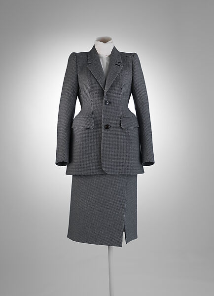Demna Gvasalia, cofounder of the Paris fashion collective Vetements, was appointed creative director of Balenciaga in 2015. At Vetements, a label known for innovative street wear, designers work collaboratively, focusing on key garments that can be worn for multiple seasons. This approach has influenced Gvasalia’s work at Balenciaga and parallels founder Cristóbal Balenciaga’s practice of reworking and refining a favored silhouette over a period of years. This suit recalls the house’s legacy of impeccable tailoring, reimagining it for a contemporary context. It is designed to subtly influence the deportment of the wearer, with shoulder seams placed toward the front and padded hips. The resulting posture recalls the distinctive bearing of a 1950s couture model— a concave stance that conveyed an attitude of haute sophistication. Gvasalia’s design reveals his interest in exploring how clothing can shape the wearer’s attitude and perception of the body.
