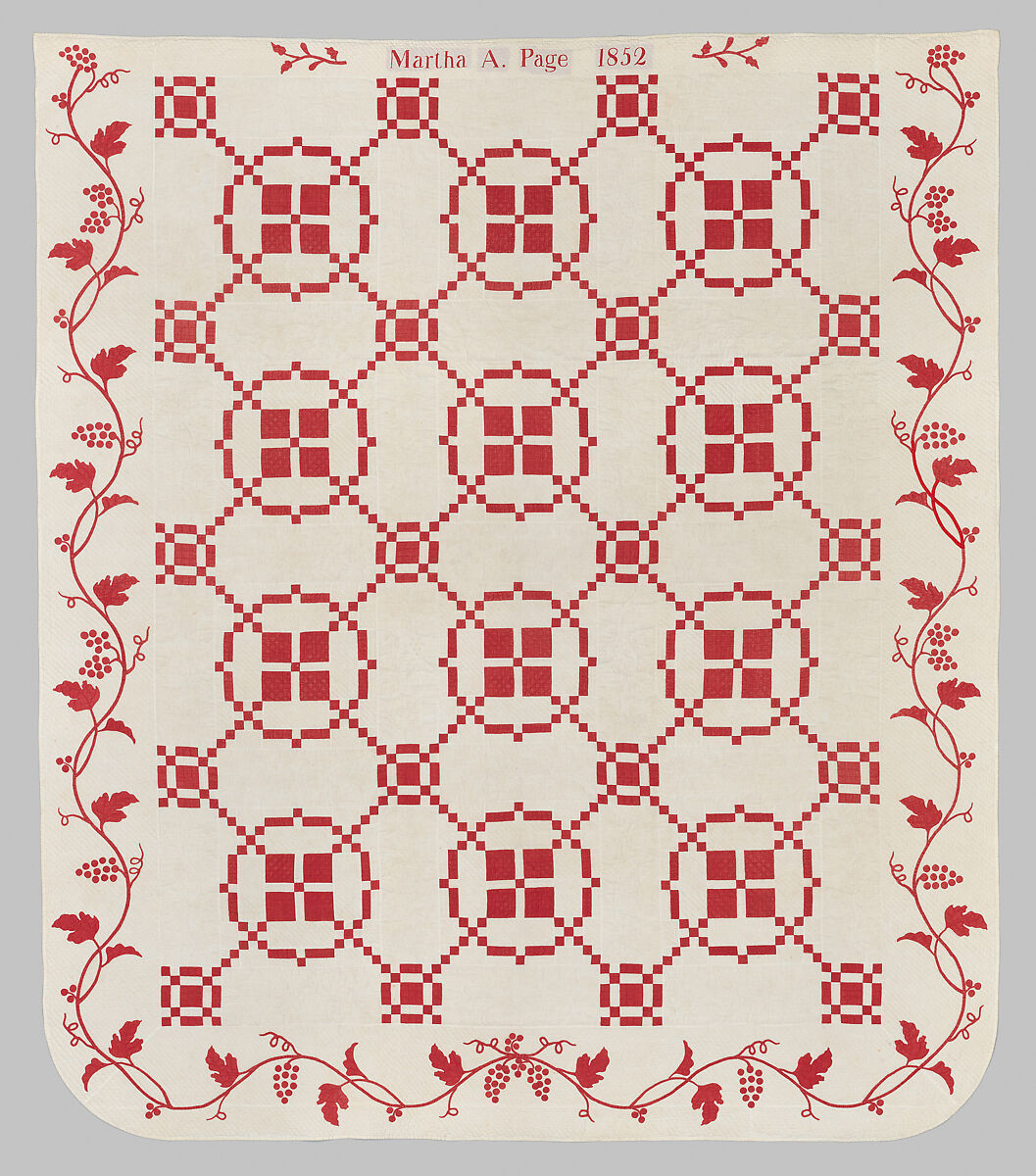 The geometric pattern of this quilt--commonly known as Burgoyne Surrenders or Burgoyne Surrounded--is said to refer to one of the most pivotal events in the American Revolution. In 1777, the British failed in their attempt to take control of the strategic Hudson River, and in the end British General Burgoyne with nearly six thousand of his men were surrounded by American troops and forced to surrender near Albany, New York. In this quilt, Burgoyne’s army is represented by the squares at the center of the blocks, encircled by the American troops. Yet, this design could have also been inspired by the simple, grid-like patterns seen in handwoven linens and woolen coverlets of the first half of the nineteenth century