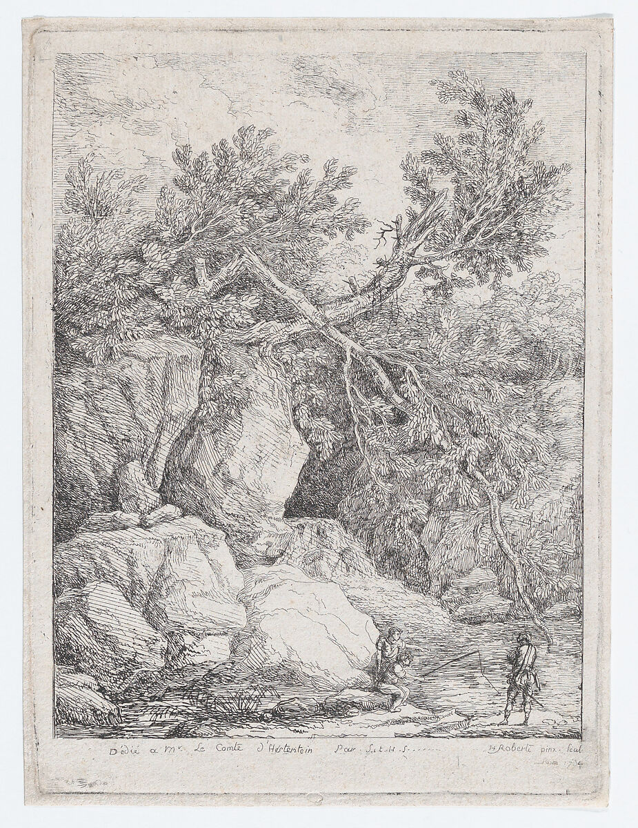 Hubert Robert forged a successful career depicting landscapes, architecture and antiquities. He made etchings only during a brief period in his youth in Rome, encouraged by friendships with local collectors, some of whom were amateur printmakers themselves. This image is inspired by a painting by Italian baroque artist Salvator Rosa, then in the collection of Robert’s patron, Jacques-Laure le Tonnelier, the Bailli de Breteuil (1722-1785), ambassador of the Order of Malta to the Holy See.