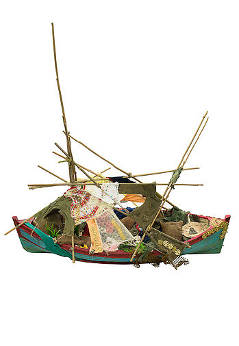 The Wine Dark Sea, by British-Guyanese artist Hew Locke, is an installation comprised of seven individual sculptures, five of which premiered at his 2016 exhibition at Edward Tyler Nahem Fine Art in New York City. The title of the installation is a nod to Homer’s Illiad and Odyssey (both of which use a Greek epithet that serves as the installation’s title) as well as to Derek Walcott’s epic poem Omeros, from 1990, itself a reference to Homer, albeit one that plays out in the Caribbean instead of the Aegean. Crafted from wood, metal, fabric, and found materials, each sculpture in The Wine Dark Sea takes the form of a vessel which is in turn based on a particular prototype. The Wine Dark Sea, U references a Coast Guard skiff. The Wine Dark Sea, AA, takes its inspiration from a more pedestrian sailing boat. The Wine Dark Sea, CC alludes to a stock military boat. The Wine Dark Sea, DD is a model of Sir Francis Drake’s The Revenge, a flagship pitted against the Spanish Armada. (This sculpture evokes more generally the large sailing galleons of the age of discovery and conquest in the 15th through the 18th centuries). The Wine Dark, H is based on a Cuban refugee boat. Boat X (from The Wine Dark Sea, Group 9) is inspired by the boats deployed in the 1979 film Apocalypse Now, the same sorts of vessels employed on military and colonial expeditions around the world. Finally, Boat F (from The Wine Dark Sea, Group 6) typifies the kind of cargo transport used along the Amazon, the site of extractive industries as well as colonial enterprise. Most of the sculptures are embellished with a profusion of chains, plastic flowers, national and organizational coins, medals, imperial regalia, military uniform badges, and the like, all of it rife with historical and symbolic import. A brass plaque on one of the ships alludes directly to a 16th-century German carving of a skeleton, for instance, while another, on The Wine Dark Sea, DD evokes the Queen Mother Pendant Mask, a 16th century ivory mask from Benin, an example of which is in The Met’s collection. The addition of cargo sacks, bags, and clothing suggests the presence of crew members who are otherwise absent. This, in turn, evokes mysterious, perhaps fatal events left to the imagination. Locke’s sculptures are meant to hang from the ceiling, creating a dense, fantastical installation—a kind of suspended flotilla that immerses viewers in both art and history. Like ships themselves, Locke’s procession conjures up a variety of narratives around maritime trade and exchange as well as migration, displacement, slavery, smuggling, colonialism, and military conflict. Locke has referred to sculptures such as these as "votive ships," both "offerings and invocations"[1] inspired by the x-votos he encountered in churches in the Caribbean and beyond. Together and individually, The Wine Dark Sea speaks to the events and catastrophes, many of them involving displaced, disenfranchised peoples of the world, that have taken place on the planet’s many bodies of water.