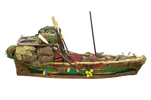 The Wine Dark Sea, by British-Guyanese artist Hew Locke, is an installation comprised of seven individual sculptures, five of which premiered at his 2016 exhibition at Edward Tyler Nahem Fine Art in New York City. The title of the installation is a nod to Homer’s Illiad and Odyssey (both of which use a Greek epithet that serves as the installation’s title) as well as to Derek Walcott’s epic poem Omeros, from 1990, itself a reference to Homer, albeit one that plays out in the Caribbean instead of the Aegean. Crafted from wood, metal, fabric, and found materials, each sculpture in The Wine Dark Sea takes the form of a vessel which is in turn based on a particular prototype. The Wine Dark Sea, U references a Coast Guard skiff. The Wine Dark Sea, AA, takes its inspiration from a more pedestrian sailing boat. The Wine Dark Sea, CC alludes to a stock military boat. The Wine Dark Sea, DD is a model of Sir Francis Drake’s The Revenge, a flagship pitted against the Spanish Armada. (This sculpture evokes more generally the large sailing galleons of the age of discovery and conquest in the 15th through the 18th centuries). The Wine Dark, H is based on a Cuban refugee boat. Boat X (from The Wine Dark Sea, Group 9) is inspired by the boats deployed in the 1979 film Apocalypse Now, the same sorts of vessels employed on military and colonial expeditions around the world. Finally, Boat F (from The Wine Dark Sea, Group 6) typifies the kind of cargo transport used along the Amazon, the site of extractive industries as well as colonial enterprise. Most of the sculptures are embellished with a profusion of chains, plastic flowers, national and organizational coins, medals, imperial regalia, military uniform badges, and the like, all of it rife with historical and symbolic import. A brass plaque on one of the ships alludes directly to a 16th-century German carving of a skeleton, for instance, while another, on The Wine Dark Sea, DD evokes the Queen Mother Pendant Mask, a 16th century ivory mask from Benin, an example of which is in The Met’s collection. The addition of cargo sacks, bags, and clothing suggests the presence of crew members who are otherwise absent. This, in turn, evokes mysterious, perhaps fatal events left to the imagination. Locke’s sculptures are meant to hang from the ceiling, creating a dense, fantastical installation—a kind of suspended flotilla that immerses viewers in both art and history. Like ships themselves, Locke’s procession conjures up a variety of narratives around maritime trade and exchange as well as migration, displacement, slavery, smuggling, colonialism, and military conflict. Locke has referred to sculptures such as these as "votive ships," both "offerings and invocations"[1] inspired by the x-votos he encountered in churches in the Caribbean and beyond. Together and individually, The Wine Dark Sea speaks to the events and catastrophes, many of them involving displaced, disenfranchised peoples of the world, that have taken place on the planet’s many bodies of water.