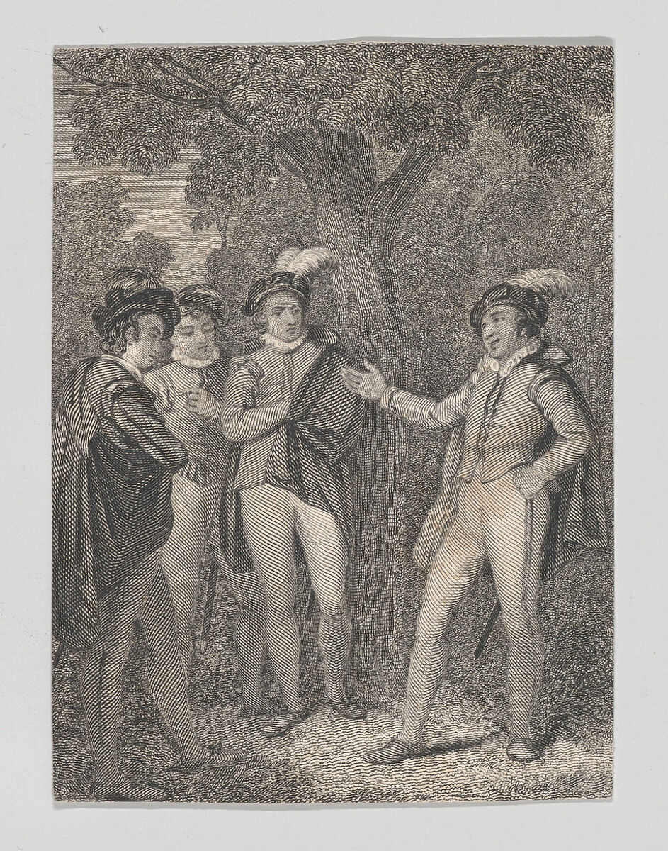 Dumain, Biron, the King, and Longaville (Shakespeare, Love's Labour's Lost, Act 4, Scene 3)