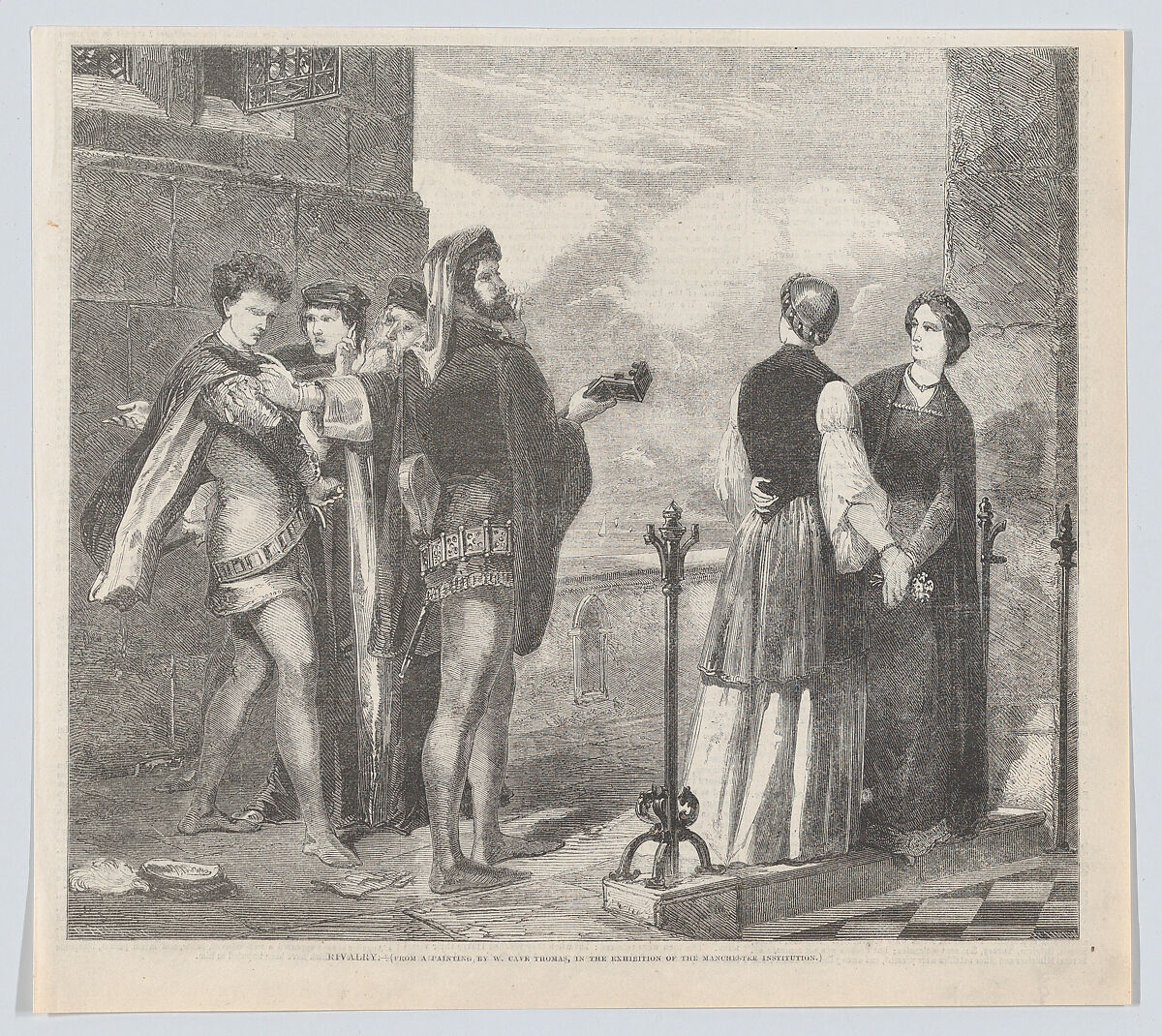 This medieval genre subject shows a young man restrained from attacking a mature rival who woos two ladies with flowers and music. Linton’s engraving reproduces a painting that William Cave Thomas exhibited at the Manchester Institution in 1857, and the print appeared in the "Illustrated Times" accompanied by a long critical review.