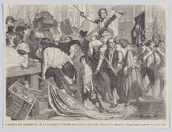 A weary, but jubilant crowd arrives at the City Hall in Paris after successfully storming the Bastille, a critical event in precipitating the French Revolution. The caption for this wood engraving, published in the "Le Journal Illustré," explains that it was made after a steel engraving by Jazet, which was in turn after a painting by Delaroche. The painting, now in the collection of the Petit Palais, was part of a state commission to celebrate the heroes of the Revolutions of 1789 and 1830 intended for the Throne Room of the Paris City Hall.