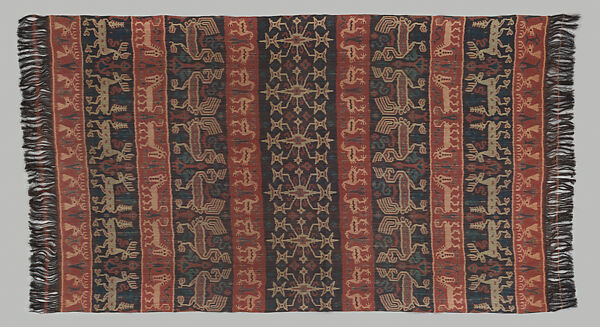 The island of Sumba in Indonesia is renowned for its technically accomplished and visually dramatic textiles. Impressive works such as this hinggi (man’s shoulder or hip cloth) were prestige garments used as formal attire by Sumba men at important events and ceremonies. Worn in matched sets, one around the hips and a second around the shoulders, cotton dyed hinggi were also an indispensable component of ceremonial gift exchange. Sumba textiles tend in general to be syncretic and heavily indebted to imported imagery. Early trade and interaction amongst the Southeast Asian island archipelagoes meant that small islands close to trade routes were extremely vulnerable to commercial and political manipulation. Nevertheless a few outlying islands such as Sumba which had relatively homogeneous populations and scant economic potential in the eyes of trading Europeans, retained their cultural integrity while still enjoying expansive interrelations with their neighbors. Skillfully interpreting geometric pattern, Sumba weavers were able to preserve trade patterns that were introduced in a Hindu-Buddhist context more than a thousand years prior and innovate. These textile allows us to highlight important narratives pertaining to global trade, encounter and dynamic innovation in the arts of this region.