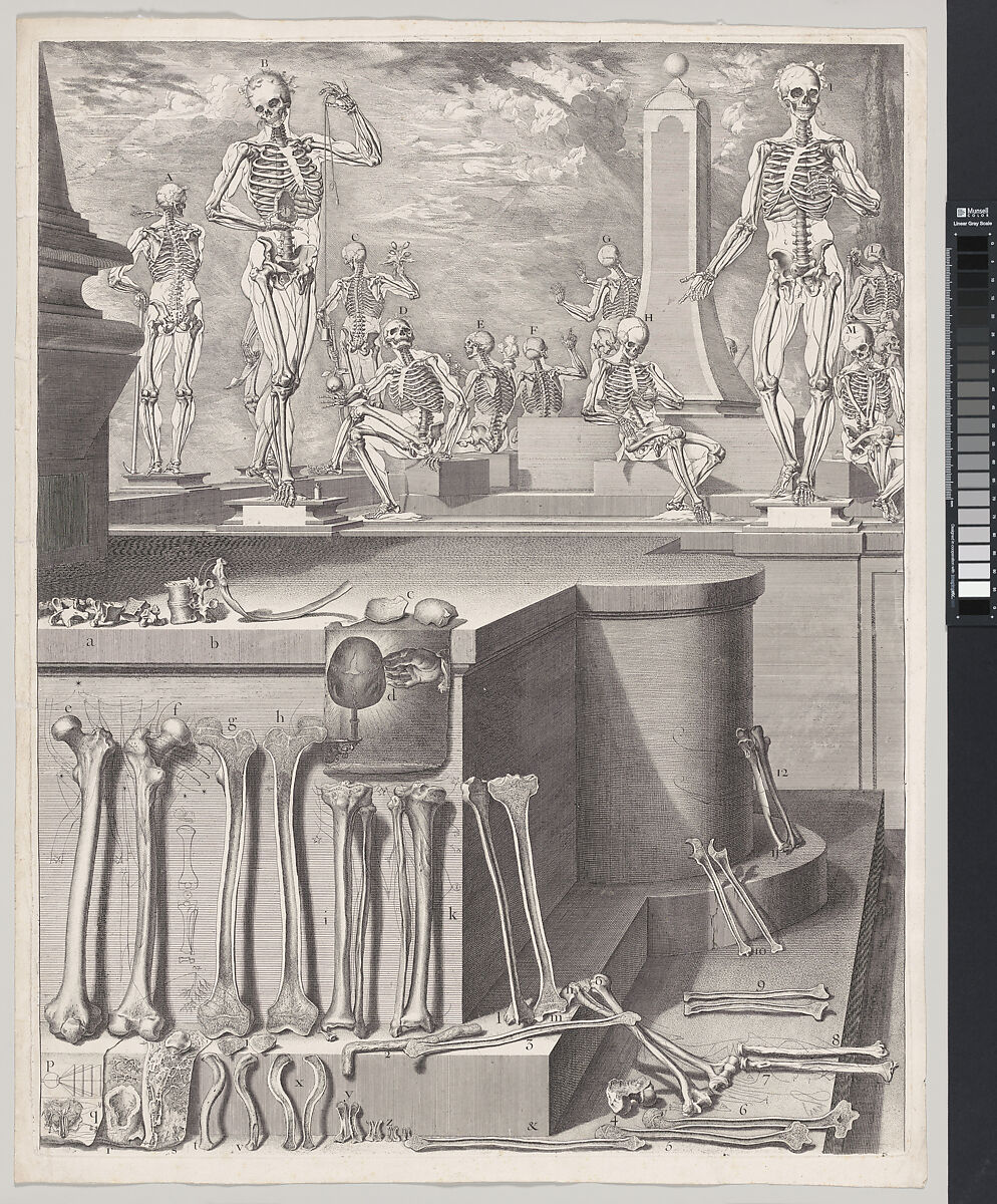 The plate was meant for the so-called 'Atlas Anatomico', by Crisostomo Martinez y Sorli. The book, as he had planned it, contained the most authoritative anatomical prints made during the seventeenth century. Instead of solely focusing on the makeup of the human body as others had done before him, his intention was to show how the parts of the body related to one another, and made it function. He used the latest technology in microscopic lenses to study the composition of individual bones and the nervous system and translated what he saw under magnification into folio-sized copperplates, which held more detail than had ever been seen in print before.