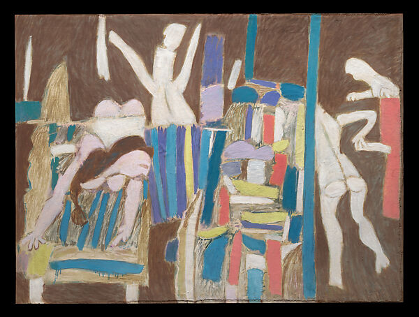 A key figure in the development of Indian contemporary art and an influential teacher and artist in his own right, Subramanyan completed this work one year prior to receiving the Rockefeller scholarship that would bring him to New York. Here Subramanyan seems to reference but also distance himself from the modernist tradition, specifically as it is represented in European oil painting. Although he consciously evoked the genre of still life, the artist mixed vibrant and energetic human figures with more ambiguous, abstract forms arranged on a studio table.