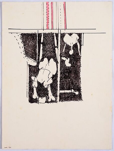 This drawing belongs to a group of five works on paper completed by the Indian artist K.G. Subramanyan after his 1966–67 Rockefeller scholarship in New York. It demonstrates a shift in his practice away from the overwrought culture of oil painting as practiced in Europe at the time, and toward the bold, sometimes naïve and cynical freedom of American artists of the 1960’s. The odd forms in the drawing, resembling figurative elements like arms or legs, unfurl like animated confetti out of an enclosed grid. The tension generated between chaos and a kind of composure produces a wonderful rhythm in the work.