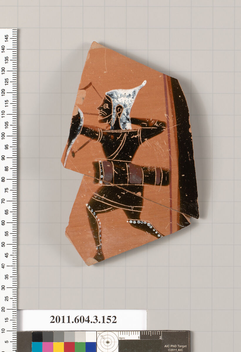 Archer to left, wearing a white Scythian cap, a chitoniskos, and greaves, with a large quiver, shooting an arrow; top of the helmet of a falling warrior?