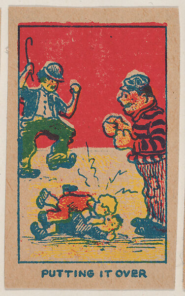 "Putting it Over" trade card from the Charlie Chaplin series (W539). Front: commercial color lithography reproducing drawings. Back is blank. Unknown number of cards in set.