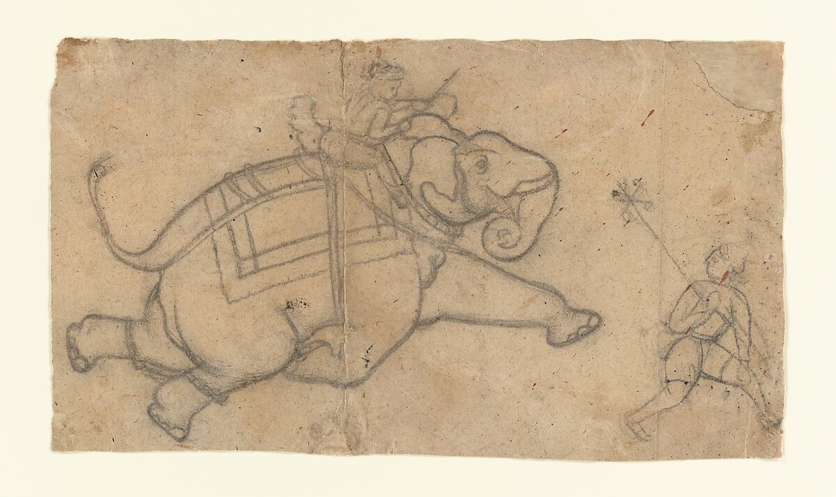 Elephants were an extremely popular subject in Kotah court painting, which largely focused on marshal themes and hunts. Here, the artist almost completely ignored the human figures; instead, the emphasis is on naturalistically capturing the elephant in motion.