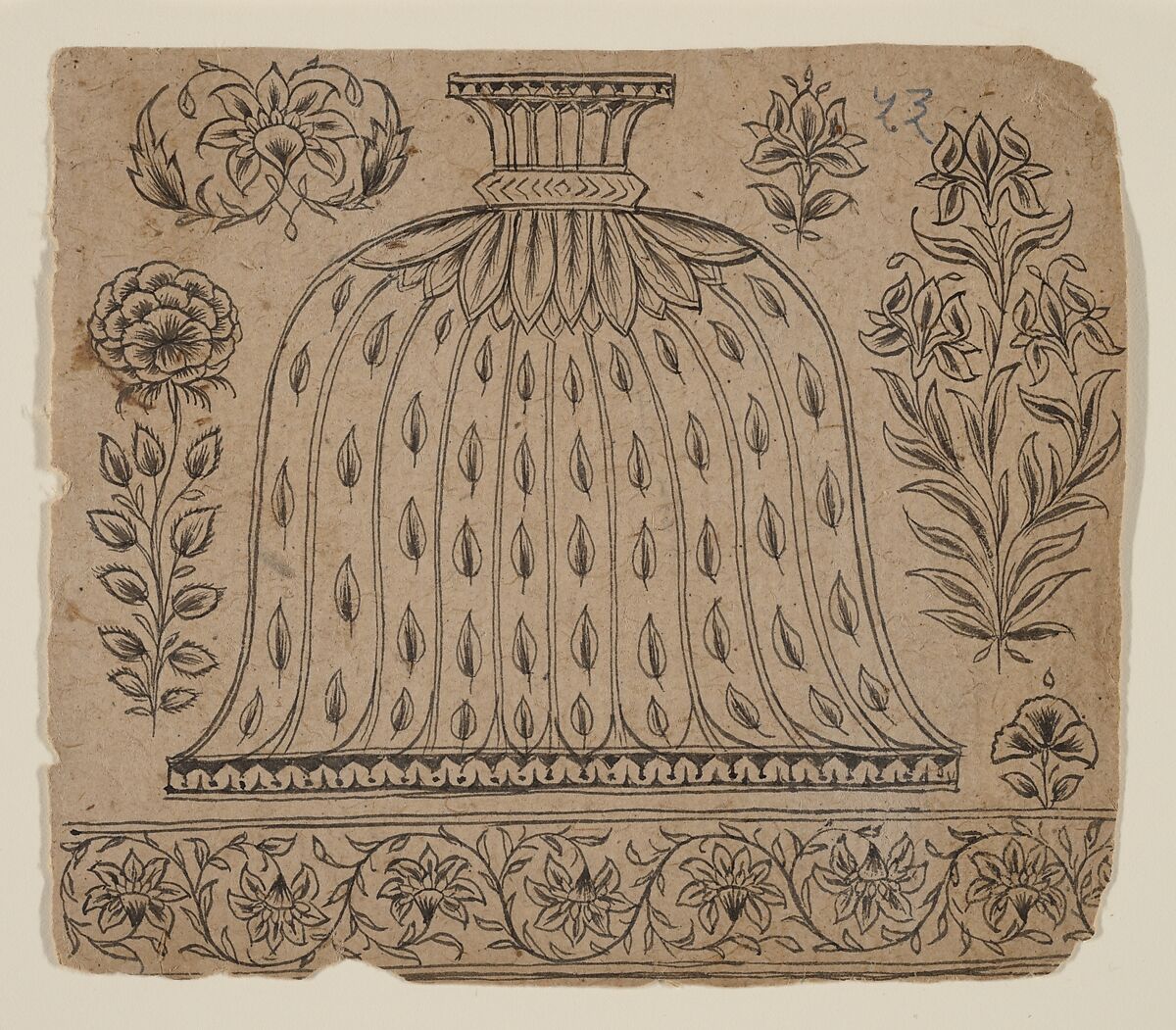 Hookahs were ubiquitous in the later Hindu courts and frequently part of the accoutrements depicted in royal portraiture. Because of their association with the nobility, such luxury objects were of quality design in high-value materials, such as silver, bidri, or painted glass. This drawing juxtaposes various floral designs of Mughal inspiration.