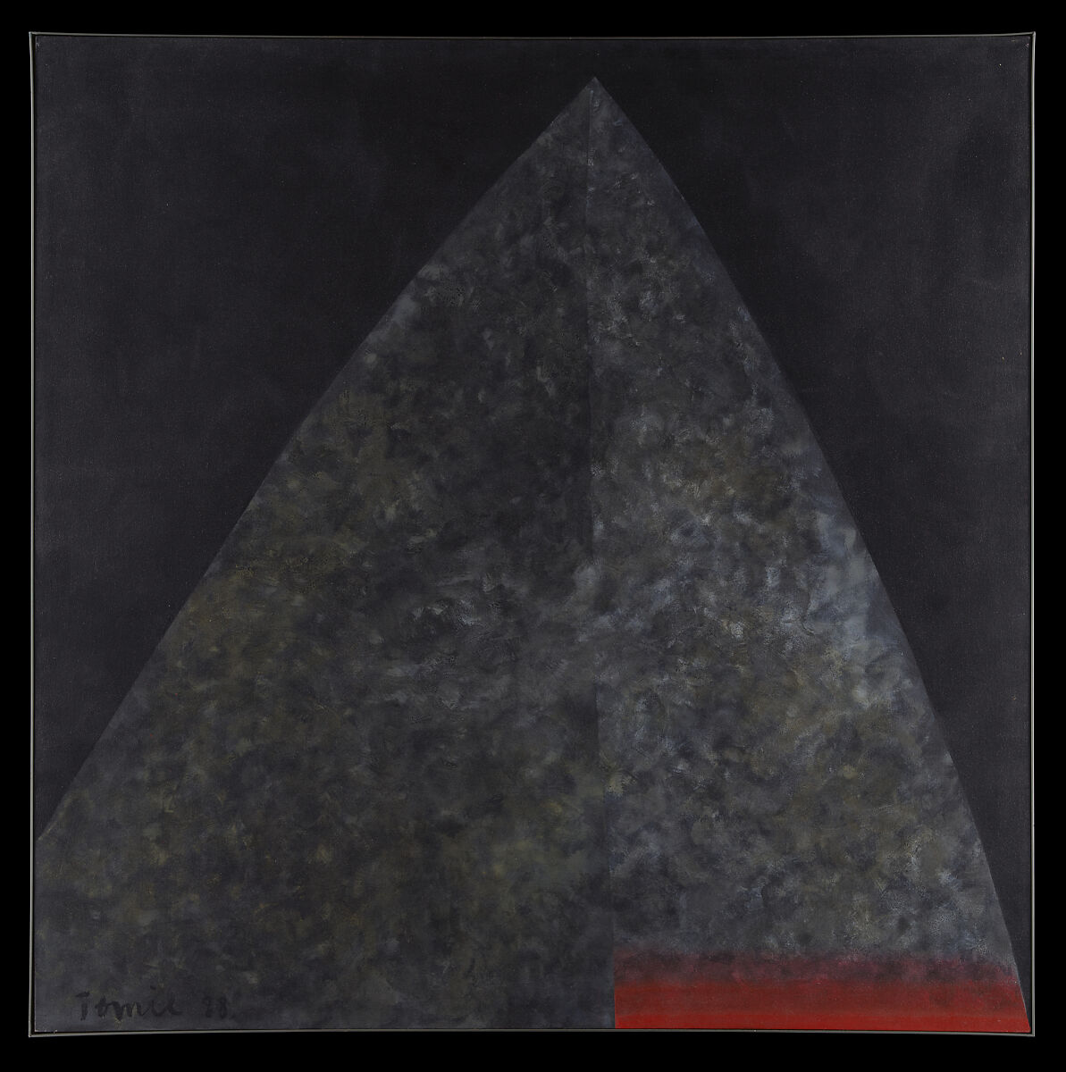 An imposing triangular shape is the central protagonist of Untitled. However, rather than a rigorous geometric shape, the asymmetry and irregularity of its composition suggest a sculpted, even organic origin of the form, an effect incremented by the textured and gestural treatment of its surface, with a mixed palette of grey tonalities that generates volume. Born in Kyoto in 1913, Ohtake travelled to São Paulo in 1936 to visit her brother and was unable to return to Japan when World War II broke out. In her artistic project, the artist combines geometric abstraction with a certain spiritual orientation. Working in Brazil but informed by the syncretic spiritual experience of Shinto-Buddhism then prevailing in Japan, her work is Western but with Japanese influence. According to the artist, "This influence is seen in the pursuit of synthesis: a few elements must say a lot."