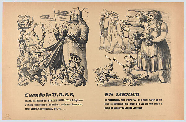Esta complicada caricatura política hace referencia a la guerra de Invierno de 1939 y a sus repercusiones en México. A la izquierda, un heroico soldado ruso planta cara a varios líderes políticos europeos (Neville Chamberlain, Benito Mussolini, Édouard Daladier y León Trotski) y sujeta un paraguas roto que simboliza a Finlandia, cuyo diminuto ejército se enfrentó a las poderosas fuerzas soviéticas. Un confuso Hitler se lleva la mano a la cabeza mientras la Sociedad de las Naciones, representada como un perro que ladra, lo amenaza tras la invasión nazi de Polonia. La mujer de la derecha encarna al imperialismo, y los loros que gritan «Comunistas» a dos obreros aluden a los periódicos conservadores mexicanos. El texto que aparece debajo critica a la prensa mexicana y describe a sus miembros como «hijos putativos» en un juego de palabras intencionadamente cercano a «hijos de puta».