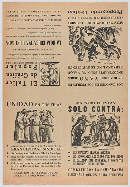 En la década de 1930, las octavillas se imprimían por miles y se distribuían en la calle o en reuniones y, en algunos casos, se lanzaban desde el aire durante los actos electorales. Estas cuatro octavillas, impresas en una lámina, se diseñaron para ser separadas. Una publicita los servicios de impresión ofrecidos por el TGP, mientras que las otras tres ensalzan la eficacia de la propaganda ilustrada. Las imágenes muestran la persecución de maestros, varias personas de distintos orígenes que trabajan juntas en armonía y un grupo de hombres acompañados por un perro que atacan a un reaccionario.