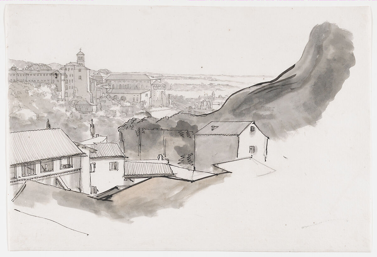His style was influenced by earlier masters, like Claude Lorrain, but also deeply indebted to the first-hand study of nature. This drawing of the Caelian Hill in Rome was made around 1750 and part of an album assembled probably in Vienna in the early 19th century. A meticulous distant view of the church of Santi Giovanni e Paolo is contrasted by the abstract treatment of rooftops in the foreground.